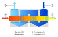 Der Wärmetauscher funktioniert nach dem Kreuz-/ Gegenstrom-Verfahren.